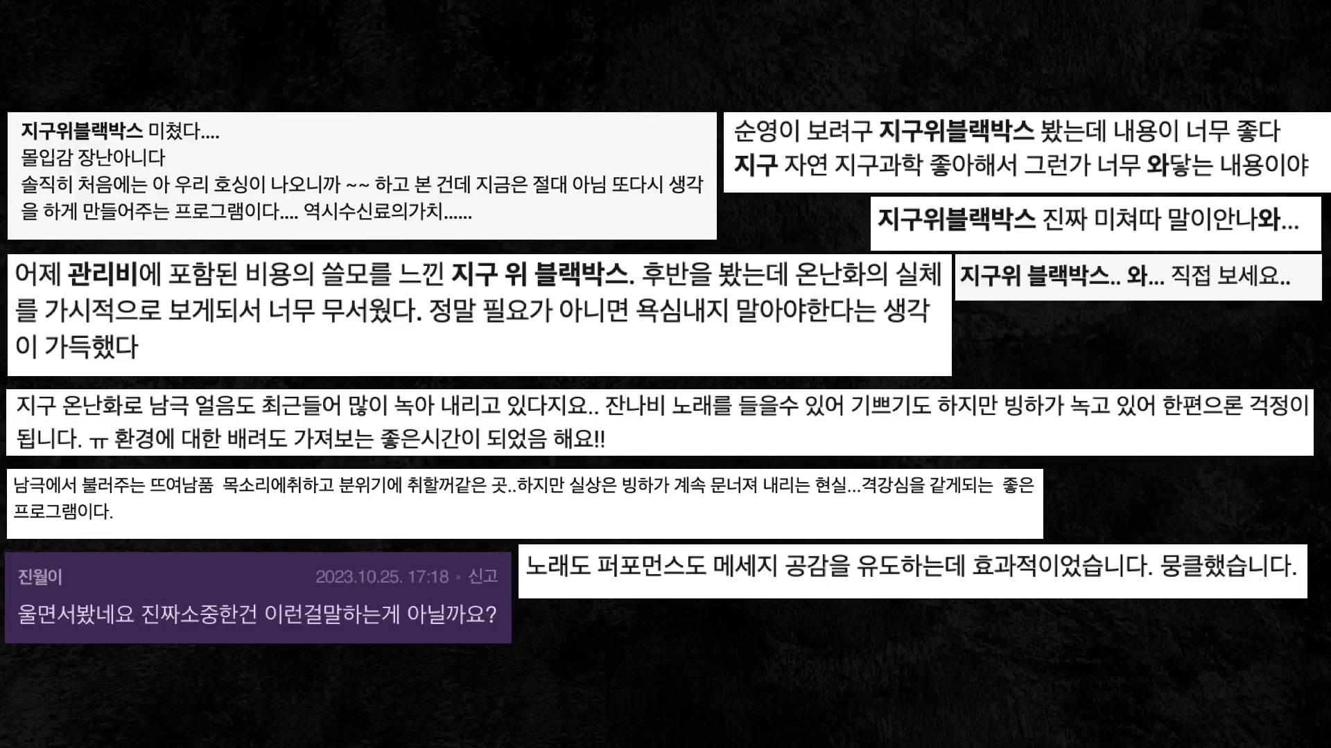 많은 시청자께서 지구의 블랙박스를 보고 주변에 자발적인 추천을 굉장히 많이 해주셨어요.