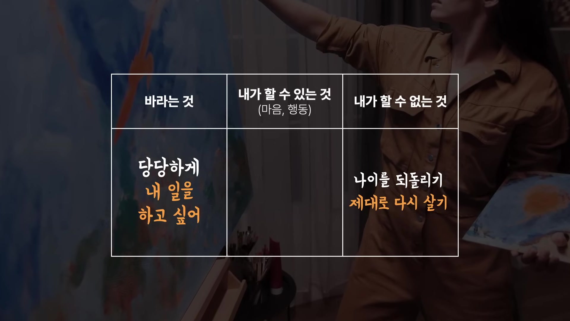 이 나이에 대한 불안감과 과거를 후회하는 것에는 좀 신경을 끄고, 내가 바라는 것과 내가 뭘 할지에 집중을 하게 만드는 표였어요.