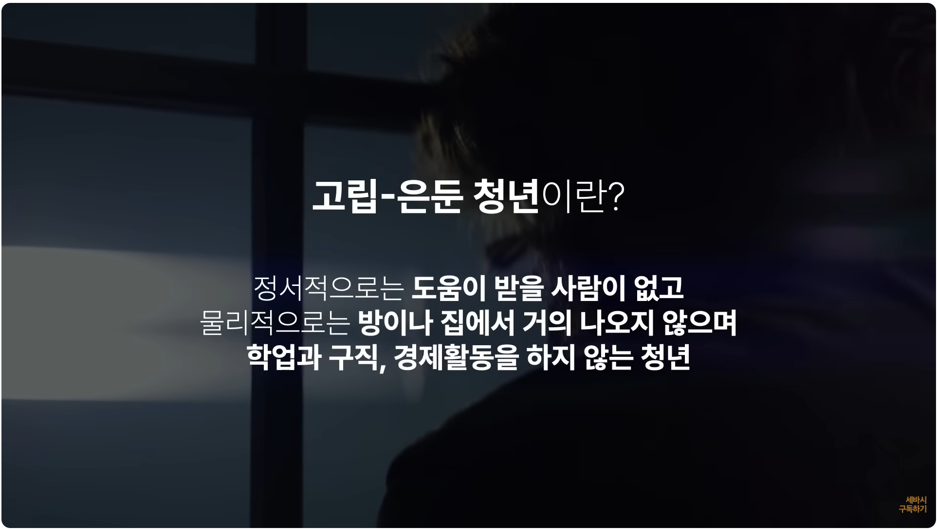 정서적으로는 도움을 받을 사람이 없고, 물리적으로는 방이나 집에서 거의 나오지 않고 학업과 구직, 경제활동을 하지 않는 청년을 말합니다.