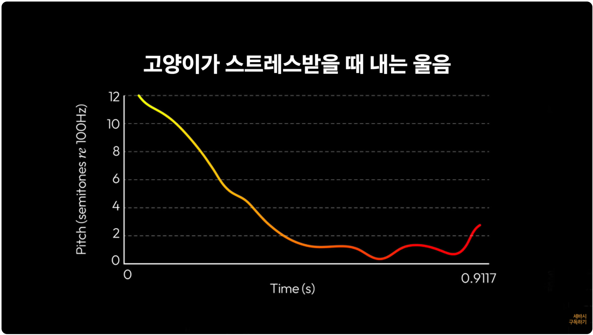 고양이가 스트레스를 받을 때는 이 화면 여기 왼쪽 그래프를 보시는 것처럼 높은음에서 시작을 해서 낮은음으로 내려가면서 약간 올라가는 울음소리를 내는 걸로 패턴이 알려져 있습니다.