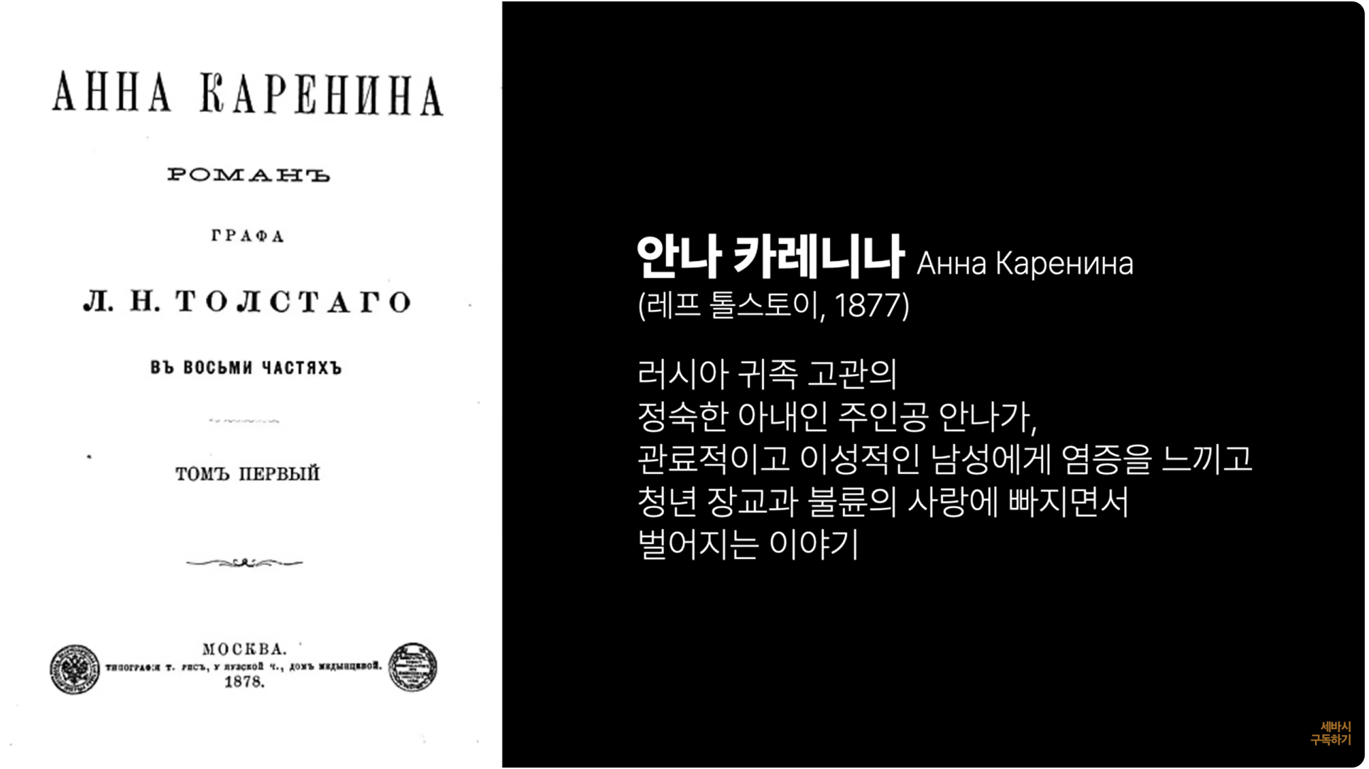안나 카레리나 너무 유명한 책이죠. 소설가들이 가장 사랑하는 소설 1위 한마디로 요약하면 뭐예요? 불륜하는 얘기잖아요.