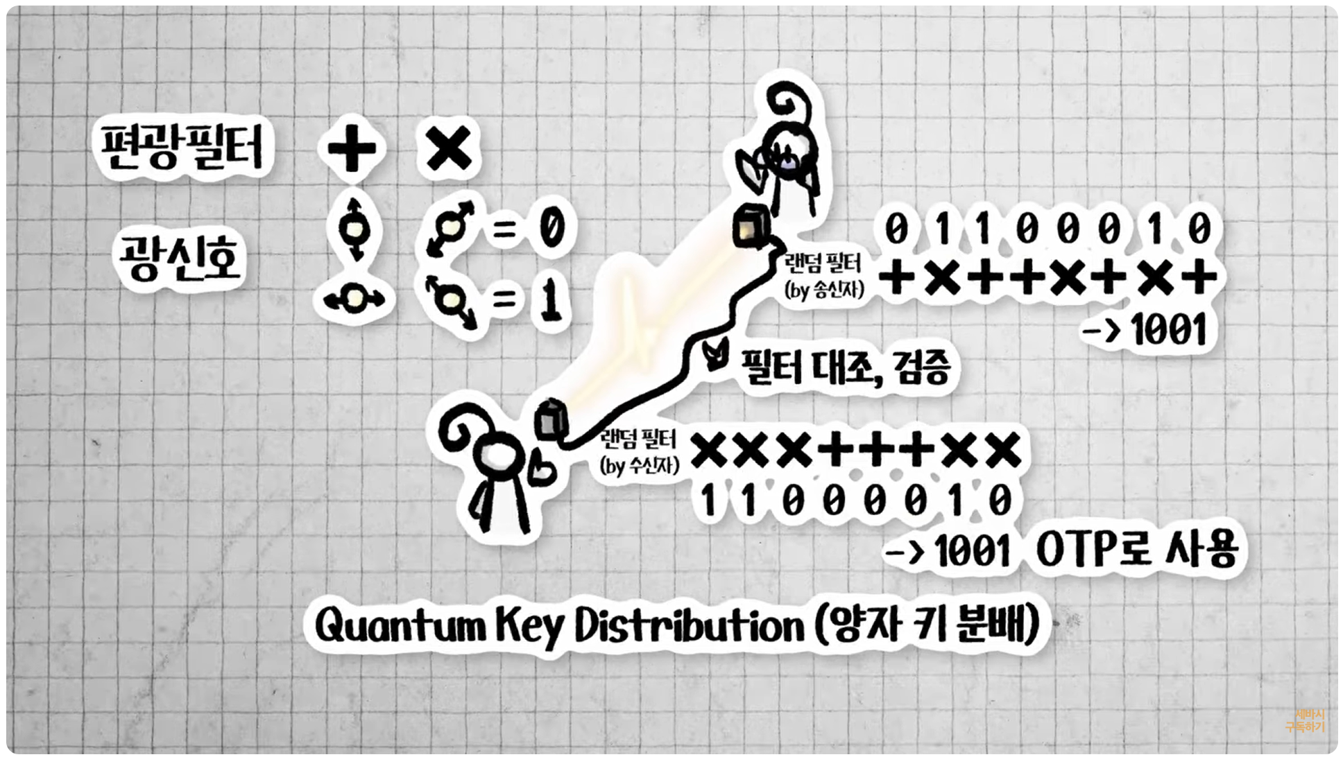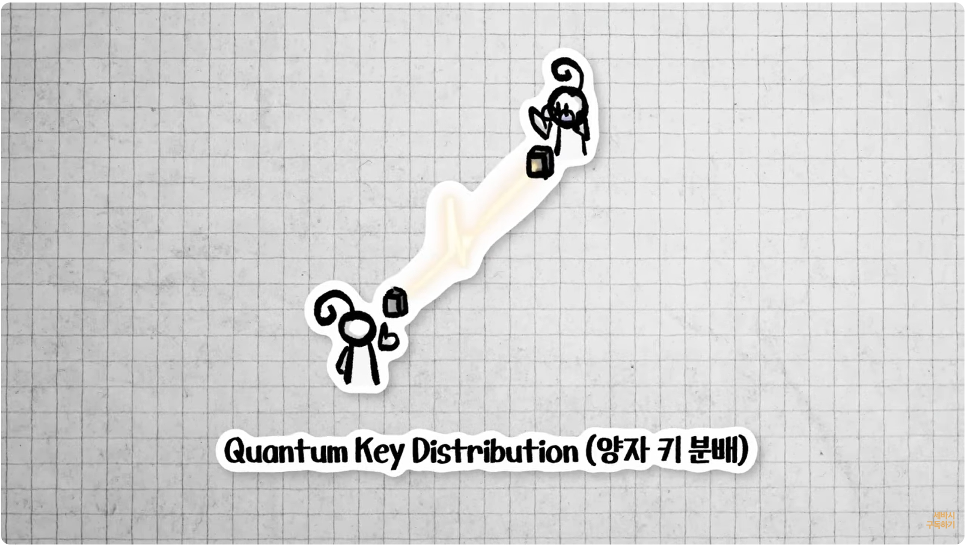 이 양자 얽힘을 이용해서 만든 양자 키 분배를 이용하면 중간에 이 정보를 누가 감청한다거나 도청하려고 할 경우 이 불확정성 원리에 의해서 그 정보 송신과 수신자의 정보가 다르게 측정되어서 양자 암호의 도청을 찾아낼 수 있다고 합니다.