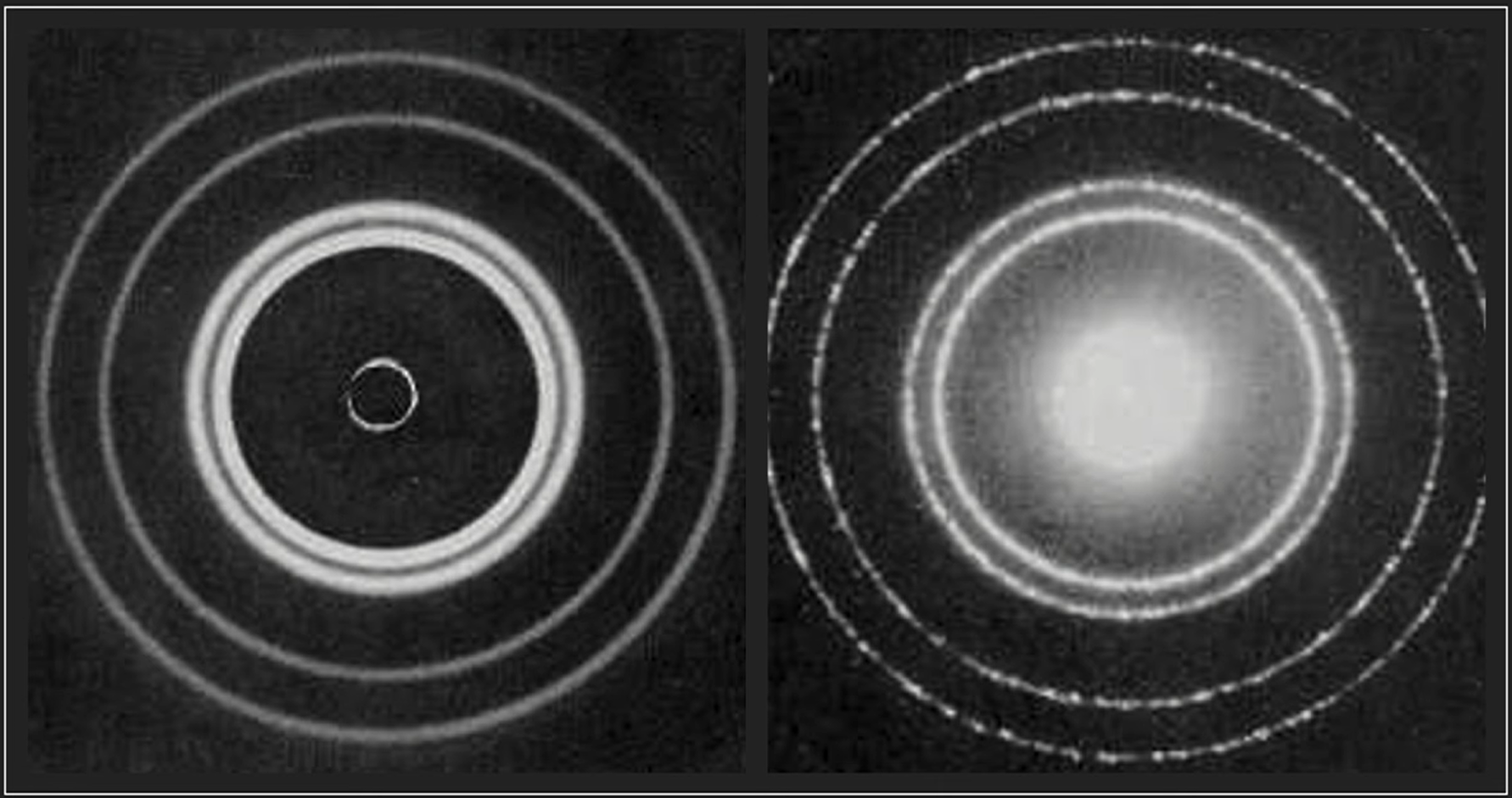 그런데 오른쪽에 있는 것은 그 빛과는 조금 다른 전자선이라고 하는 전자를 발사해서 알루미늄 포일에다가 쐈을 때 뒤쪽에 전자가 맺히는 그 무늬입니다.