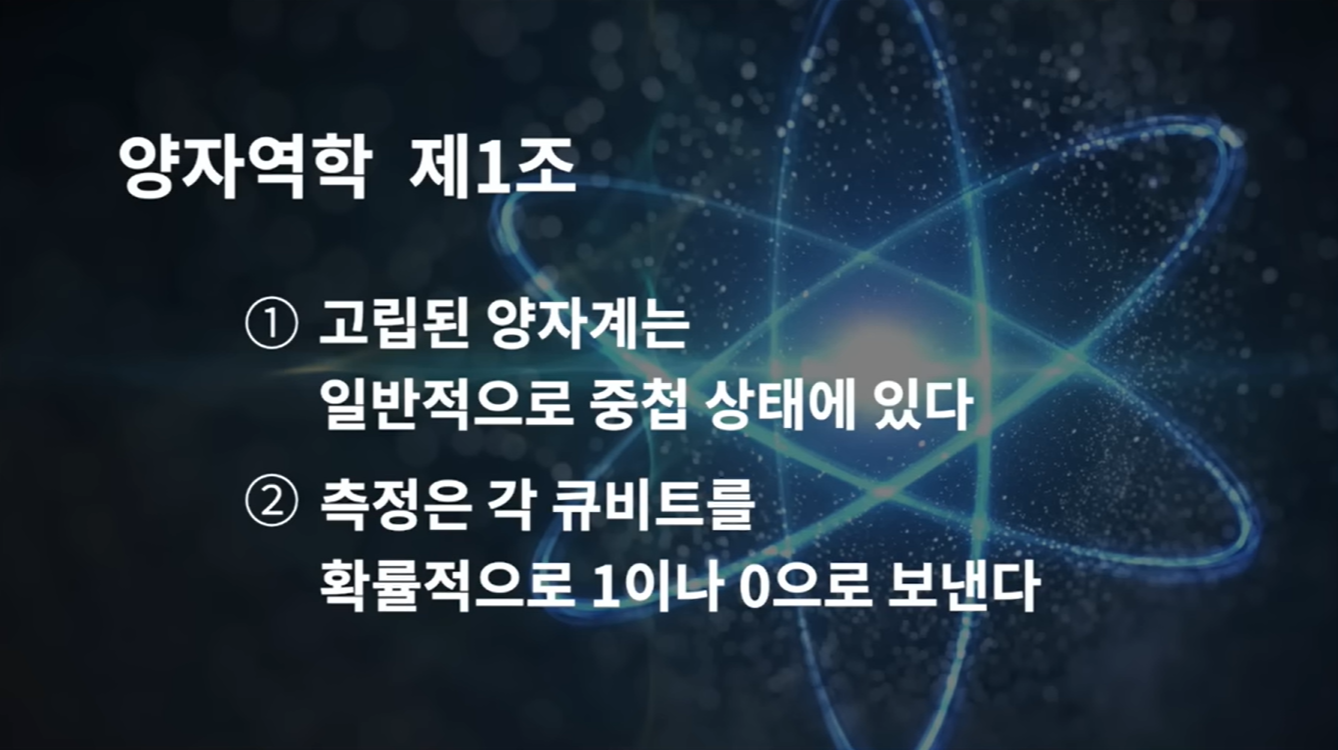 양자역학 헌법의 제1항은 1조 1항은 일반적인 큐비티의 방향이 0과 1이 다른 확률로 중첩된 상태라고 말하는 거죠.