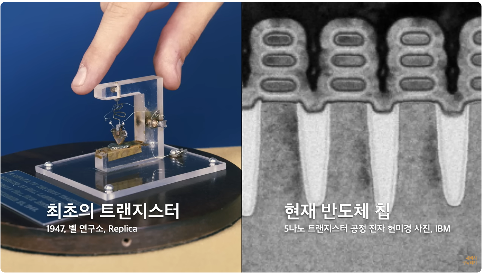 보시는 왼쪽에 있는 사진이 최초의 트랜지스터 최초의 반도체 소자입니다. 1947년에 만들어졌고요.