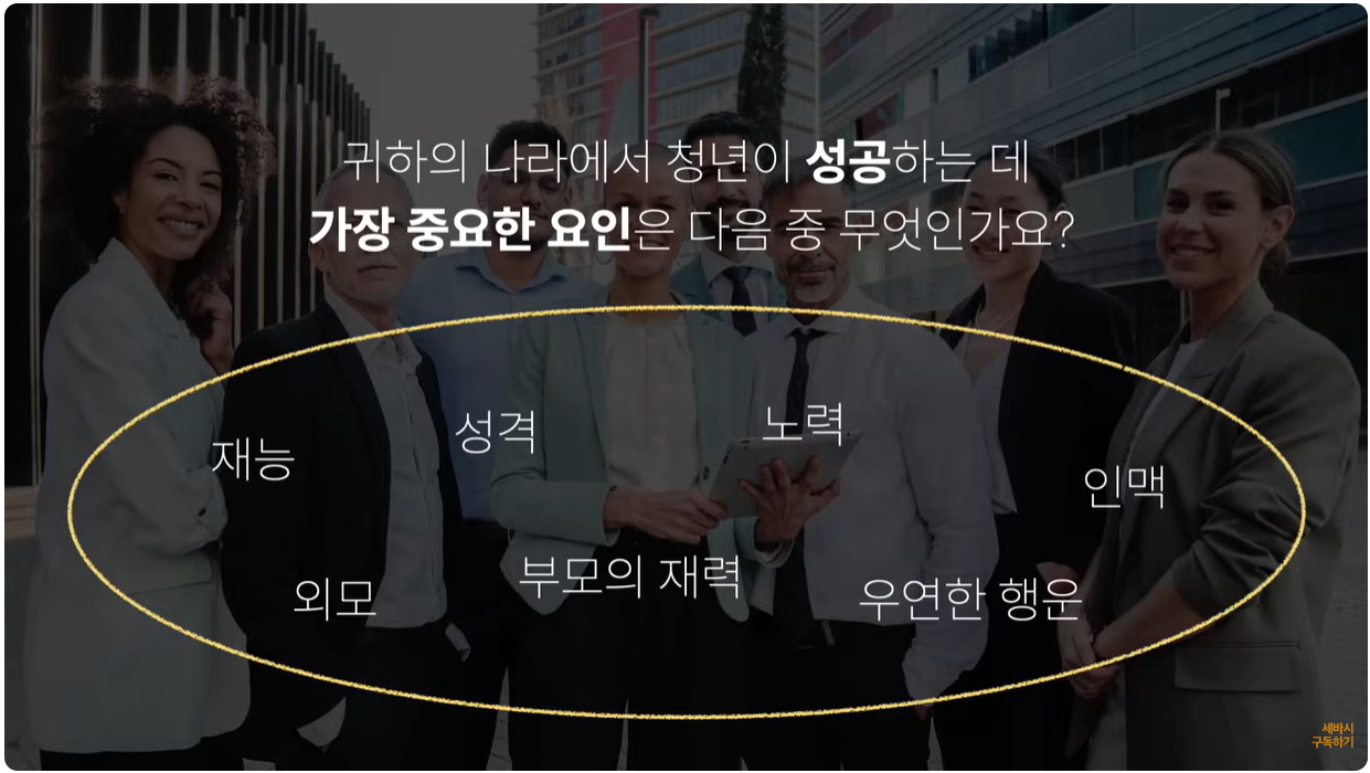 제가 20대 대학생 청년들에게 우리 사회에서 청년이 성공하는 데 가장 중요한 요인이 뭔지 고르게 했어요.