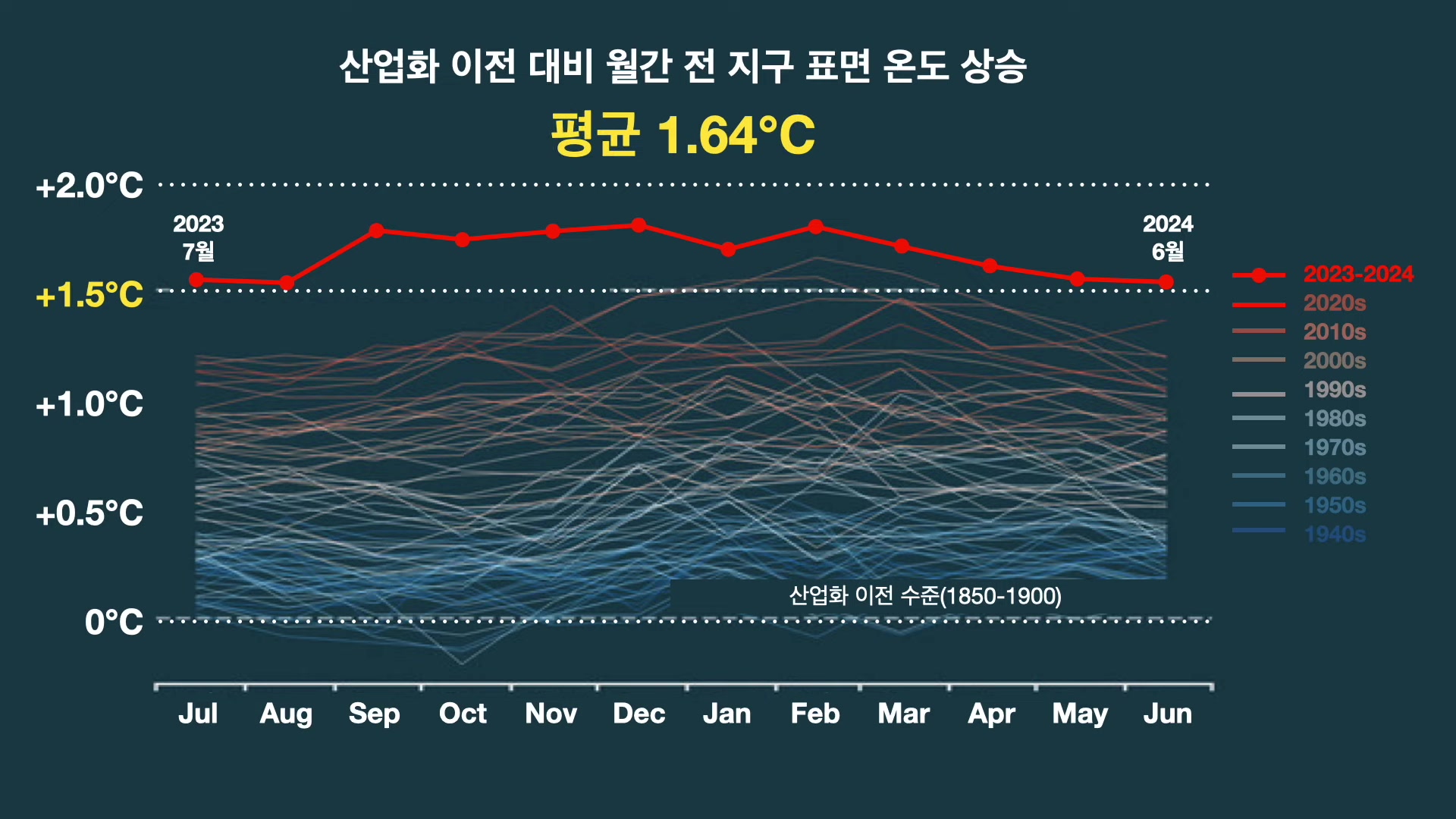 그런데 2023년 7월부터 2024년 6월까지 1년 동안만 보면 산업화 이후 기온 상승이 1 64도에 달했습니다.