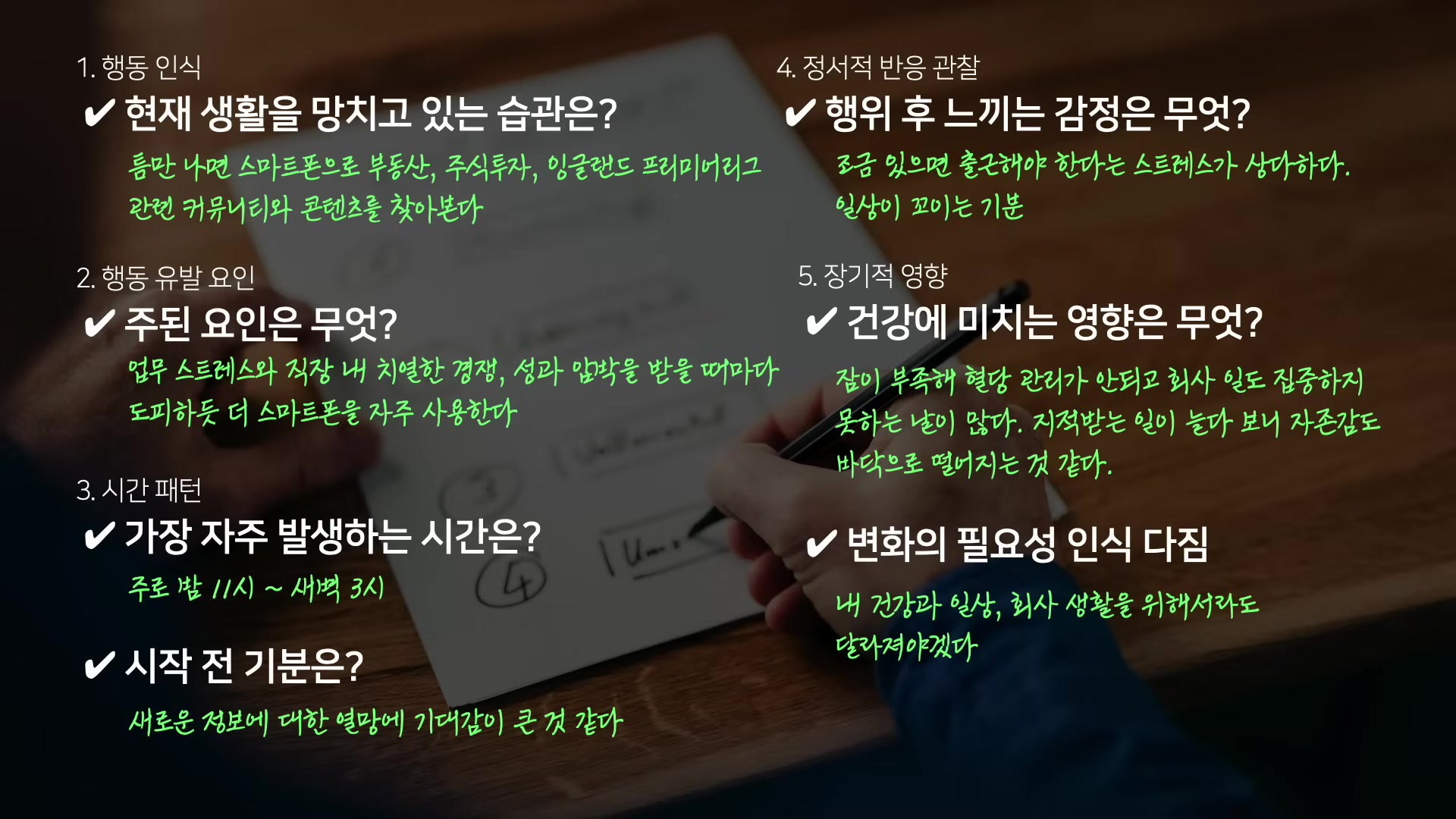 첫째, 자가진단과 도파민 일지를 통해 내가 무엇에 중독돼 있는지 인식한다.